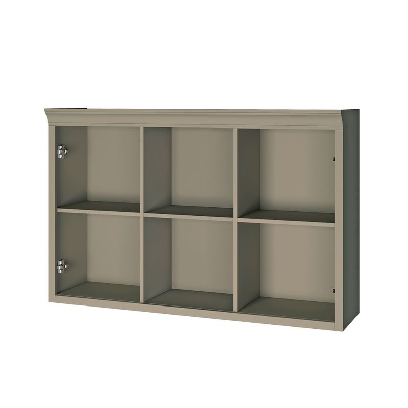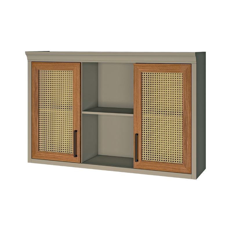 Este aéreo presenta un diseño de estilo provenzal, con líneas cuidadas y una estética equilibrada. Incorpora dos puertas y un nicho abierto, lo que permite organizar y exhibir elementos de uso frecuente, manteniendo todo al alcance de la mano.