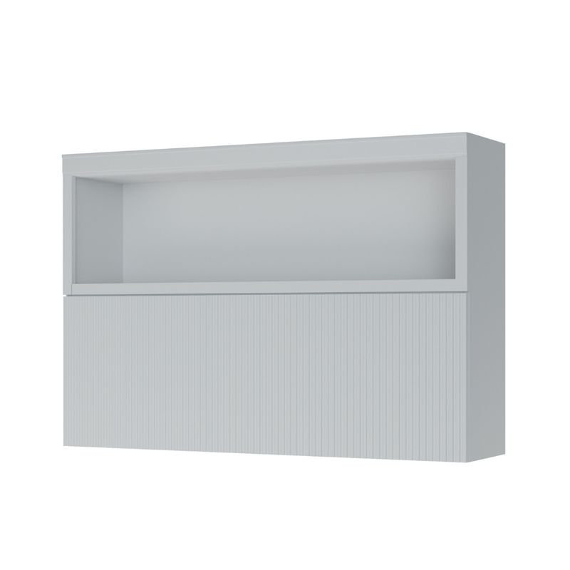 Este aéreo cuenta con una puerta con pistón a gas, que facilita una apertura cómoda y segura. Su distribución interna incluye estantes bien organizados, ideales para almacenar vajilla, recipientes y artículos de uso cotidiano. El tirador oculto aporta una estética moderna y uniforme al frente del mueble.