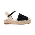 La Alpargata Plataforma Flatform Negro Mujer Vizzano es un calzado de estilo veraniego, casual y cómodo, ideal para disfrutar de la temporada cálida con elegancia y ligereza. Su diseño combina la puntera negra con acabado trenzado o crochet con el talón y la tira trasera de lona natural beige claro, ofreciendo un contraste moderno y sofisticado. La plataforma plana está completamente forrada con esparto trenzado (yute), aportando un look fresco y estético. La tira ajustable al tobillo con hebilla negra asegura un calce firme y seguro.