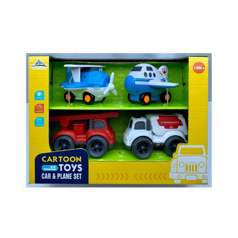 Este set de juguetes tipo cartoon está diseñado para brindar una experiencia de juego segura, divertida y didáctica para niñas y niños pequeños. Incluye cuatro vehículos: un avión biplano, un avión jet, un camión de bomberos y una ambulancia. Cada pieza está pensada para estimular la imaginación mediante formas amigables, bordes redondeados y un funcionamiento sencillo para manos pequeñas.