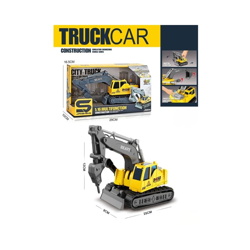Esta excavadora multifunción en escala 1:16 está diseñada para brindar una experiencia de juego realista y dinámica. Cuenta con brazo y pala móviles que permiten simular actividades propias de una obra. Incorpora orugas firmes que facilitan el desplazamiento y un sistema interactivo que activa luces y música al presionar un botón, lo que enriquece la imaginación y el entretenimiento de niñas y niños.