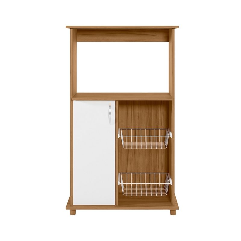 Cuenta con una puerta y dos fruteras de metal, perfectas para almacenar frutas, verduras u otros productos de manera ordenada.