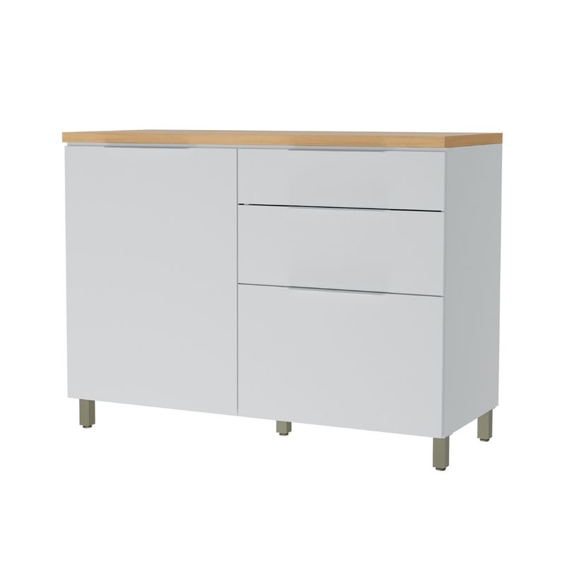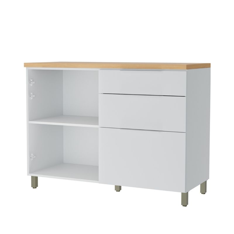 Este balcón cuenta con una puerta y tres cajones, pensados para organizar utensilios, comestibles y otros elementos de uso frecuente. Los cajones con corredizas telescópicas permiten un deslizamiento suave y seguro, mientras que el organizador de cubiertos facilita mantener los utensilios ordenados. El tampo superior de 30 mm asegura mayor resistencia y estabilidad, y el mueble está diseñado para soportar pileta.