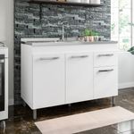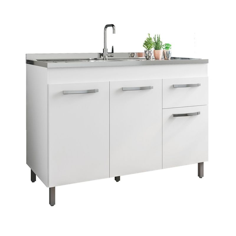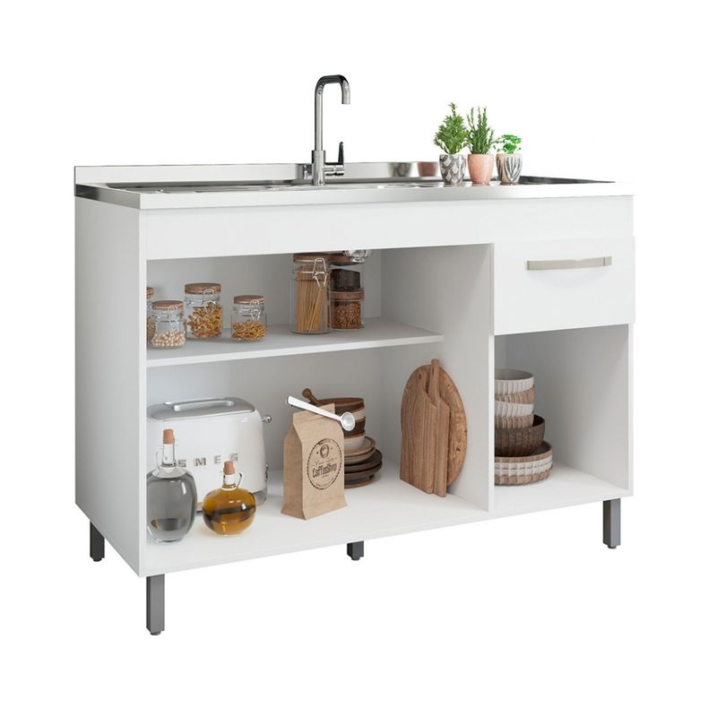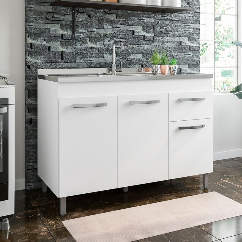 Dispone de tres puertas y un cajón, ofreciendo espacio adecuado para organizar productos de limpieza, utensilios y accesorios de cocina. Su estructura está pensada para la instalación de pileta, adaptándose a diferentes configuraciones del ambiente.