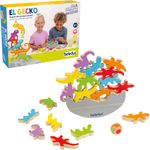 Este juego incluye 18 geckos de madera en seis colores y formas diferentes y una práctica base basculante de madera de dos piezas.