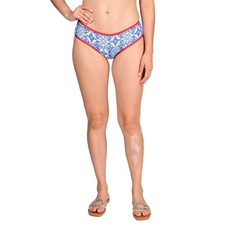 Bikini con braga clásica de tiro bajo diseñado para ofrecer comodidad y un ajuste favorecedor. Presenta un elegante estampado de azulejos azules y blancos, combinado con un delicado ribete fino de color rojo liso en la cintura y el contorno de las piernas, aportando un detalle sofisticado y moderno. La cobertura media garantiza confort y libertad de movimiento, haciendo que esta prenda sea ideal para disfrutar de la playa, la piscina o actividades al aire libre con estilo.