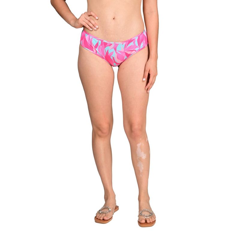 Bikini clásica de tiro bajo diseñada para quienes buscan un estilo femenino, cómodo y elegante. Presenta un estampado de hojas en tonos rosa, fucsia y turquesa, aportando frescura y modernidad al look de playa o piscina. Su corte tradicional en piernas y cadera ofrece una cobertura media que combina confort y libertad de movimiento, ideal para quienes prefieren un estilo clásico y sofisticado sin sacrificar estilo ni seguridad durante el uso.