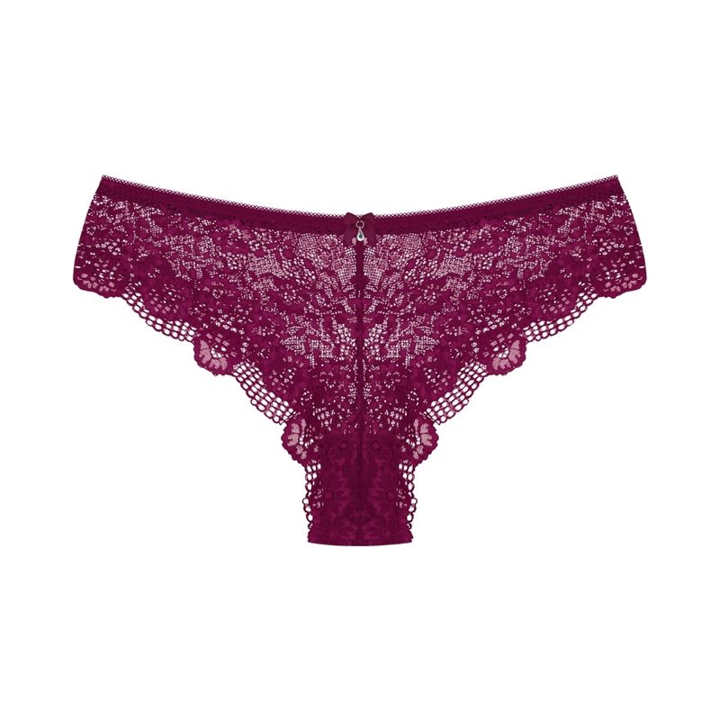 El Bikini Bordo de Fidelita es una tanga de encaje diseñada para realzar la silueta femenina con elegancia y sensualidad. Su diseño de cintura ligeramente alta y laterales de ancho medio proporciona un calce cómodo, ideal para quienes buscan una prenda delicada pero funcional.