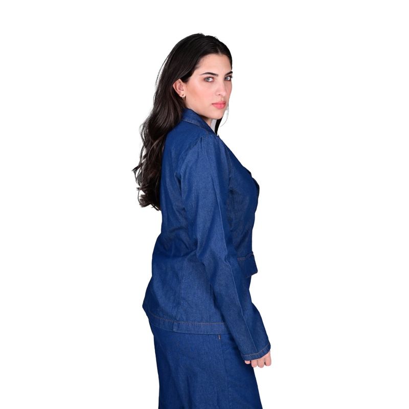 Fabricado en denim resistente y duradero, este blazer asegura larga vida útil y comodidad durante todo el día. El tejido mantiene su forma y estructura, permitiendo un look impecable en cualquier ocasión. Las costuras reforzadas y el acabado de calidad garantizan que el blazer conserve su diseño incluso con uso frecuente.