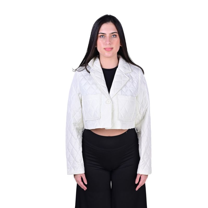 El Blazer Matelace Corto Marfil Mujer L'exclusif es una prenda que combina elegancia y textura para realzar cualquier atuendo. Su diseño acolchado con patrón de rombos aporta un estilo sofisticado y moderno, mientras que el color marfil ofrece una base neutra y versátil. Cuenta con un cuello de solapa clásico y mangas largas que brindan un equilibrio perfecto entre comodidad y distinción. En la parte frontal, un bolsillo con solapa en el lado izquierdo del pecho añade funcionalidad y detalle visual. El cierre frontal con un solo botón ofrece un ajuste estilizado y práctico.
