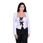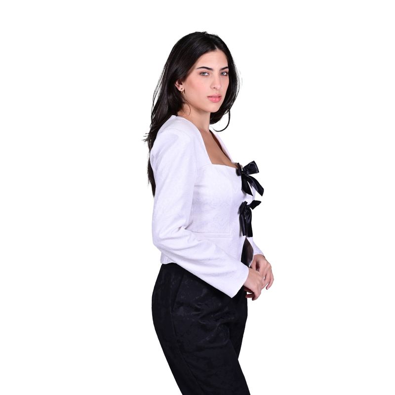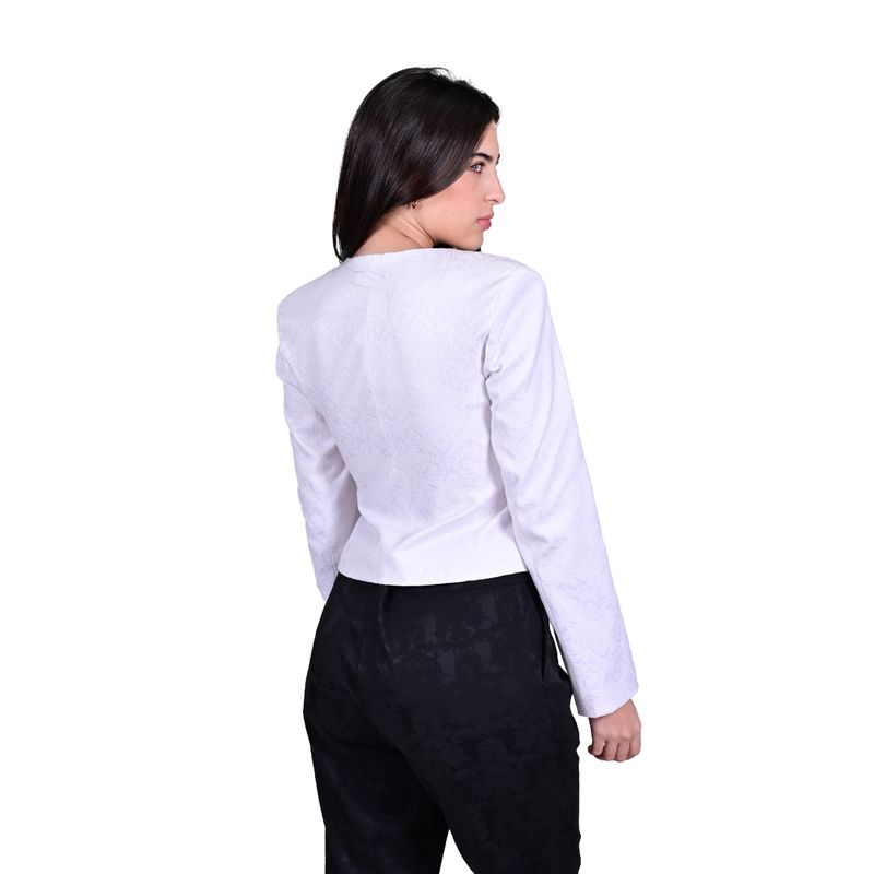 Este blazer tipo spencer de la marca Juliette está confeccionado en elegante brocado blanco, ofreciendo un toque sofisticado y femenino. Su diseño entallado realza la silueta, siendo ideal para eventos formales o como pieza destacada en conjuntos casuales. Combínalo con pantalones de vestir o faldas lápiz para un look refinado. Se recomienda seguir las instrucciones de lavado del fabricante para mantener la calidad del tejido.