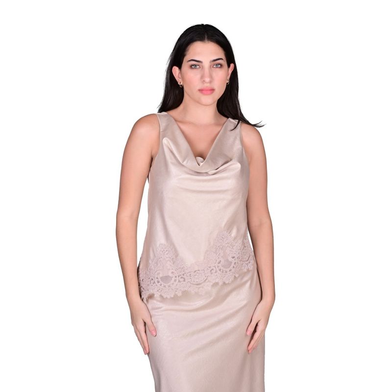 La Blusa Asimétrico Cuello Volcado Beige Claro Mujer Juliette es una prenda que combina estilo, elegancia y comodidad. Su corte recto y holgado ofrece un ajuste relajado que se adapta a diferentes tipos de cuerpo, mientras que el cuello volcado (cowl) en el frente aporta un detalle sofisticado y moderno. La espalda con escote redondo brinda un acabado delicado y femenino, equilibrando la silueta de la prenda. Además, la blusa incluye aplicación de encaje en el bajo, agregando un toque elegante y texturizado que realza el diseño general.