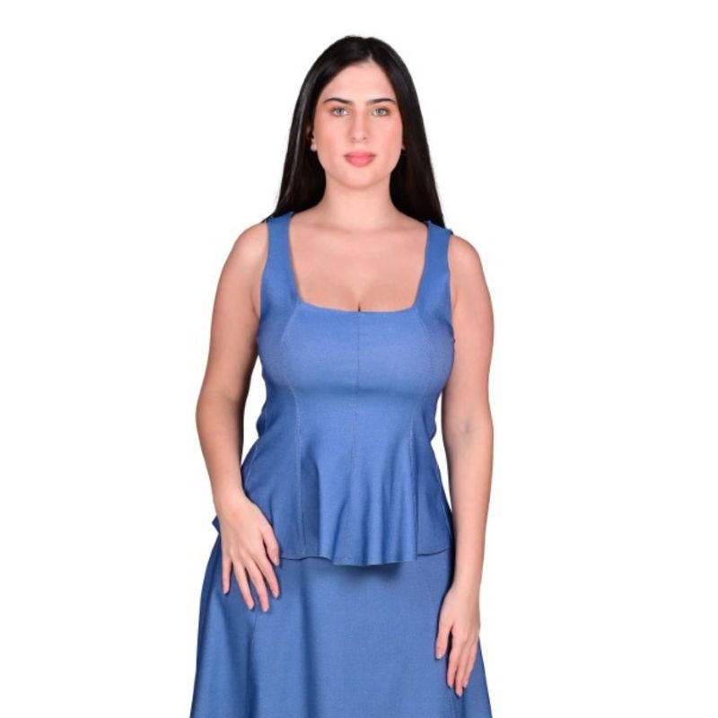 El top cuenta con costuras estratégicas a lo largo del busto, que proporcionan forma y definición a la prenda. La cintura está marcada con una costura que da paso a un pequeño volante o péplum en la parte inferior, el cual se ensancha ligeramente sobre las caderas, creando un efecto delicado y sofisticado. El diseño sin mangas y el corte estructurado hacen de esta blusa una prenda versátil y elegante.