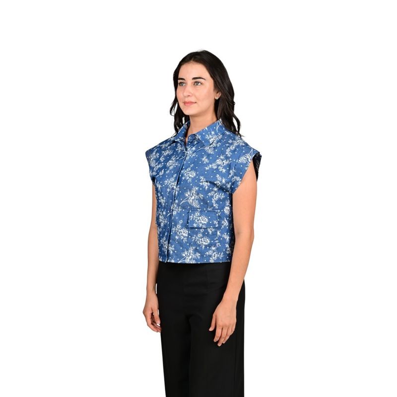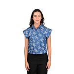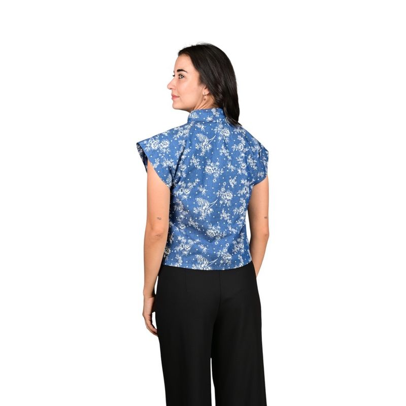 Blusa crop de estilo femenino con bordados en broderie, diseñada para un look fresco y elegante. Presenta estampado floral blanco sobre fondo azul, cuello de solapa y mangas cortas estilo cap sleeves que aportan un detalle delicado y sofisticado. Ideal para combinar comodidad y estilo en cualquier ocasión.