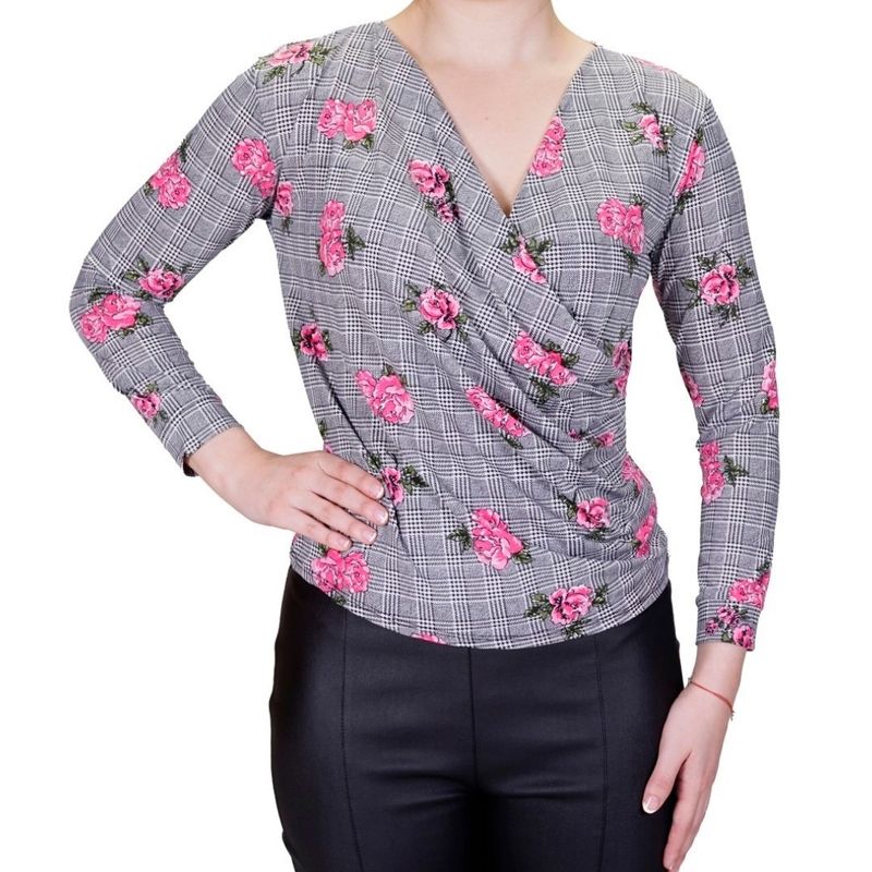 La blusa cruzada de manga larga L'exclusif combina un diseño moderno con detalles elegantes. Su escote en V y el cruce frontal crean un efecto drapeado y fruncido en la cintura que estiliza la silueta femenina. El estampado mezcla cuadros grises y blancos con flores en tonos rosados, logrando un contraste vibrante y sofisticado que realza cualquier look.