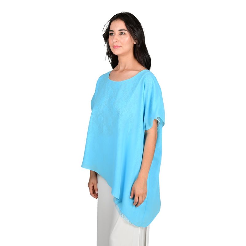 Esta blusa de mujer en color azul turquesa combina frescura y elegancia en un diseño ideal para la temporada de verano. Confeccionada en tejido fluido, presenta un sutil estampado de encaje que aporta textura y delicadeza al look. Cuenta con cuello redondo, mangas cortas y bajo asimétrico, creando una caída ligera y moderna que realza la silueta y permite múltiples combinaciones de estilo. Perfecta para salidas diurnas, almuerzos, reuniones sociales o cualquier ocasión donde se busque un look femenino y sofisticado.