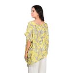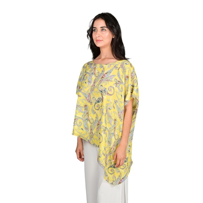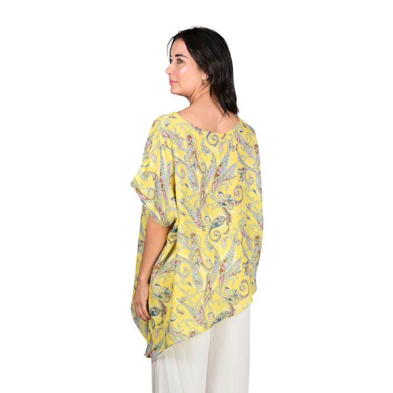 Esta blusa en color amarillo limón destaca por su diseño fresco y elegante, perfecto para la temporada de verano. Presenta un delicado estampado paisley en tonos pastel que aporta un toque femenino y sofisticado. Con cuello barco y bajo asimétrico, ofrece una caída fluida y moderna que permite crear looks versátiles y atractivos para salidas diurnas, almuerzos o reuniones sociales.