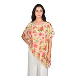 Esta blusa tipo poncho destaca por su diseño fresco y sofisticado, ideal para la temporada de verano. Confeccionada en color crema y decorada con un vibrante estampado floral en tonos rosa y rojo, aporta un toque femenino y moderno. Presenta cuello redondo y bajo asimétrico que permite una caída fluida y elegante, creando un look relajado pero sofisticado. Perfecta para salidas diurnas, almuerzos o reuniones sociales donde se desee un estilo cómodo y atractivo.
