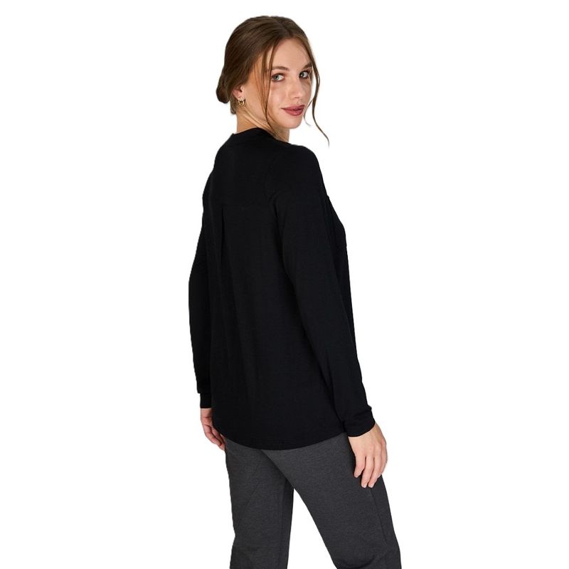 Blusa manga largas maya color negro con cierre polera. La marca Woman es esencial para mujeres audaces, misteriosas y arriesgadas que les gusta probar looks distintos.