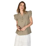 La blusa Alba de Eclipse combina frescura y estilo en una prenda versátil, ideal para diferentes ocasiones. Presenta un escote en V con tapeta y tres botones de color marrón oscuro que aportan un detalle rústico y elegante. Las mangas cortas tipo volantes, con varias capas que parten desde los hombros, añaden un toque femenino y dinámico, mientras que el corte suelto y ligeramente acampanado en la parte inferior brinda comodidad y libertad de movimiento.