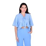 La Blusa Manga Corta Con Volados Estilo Boho Celeste Mujer Tiare es una prenda femenina y moderna que combina un diseño bohemio con un toque elegante. Su corte crop y textura arrugada aportan frescura y movimiento, mientras que el escote en “V” con lazo frontal permite un ajuste delicado y decorativo.