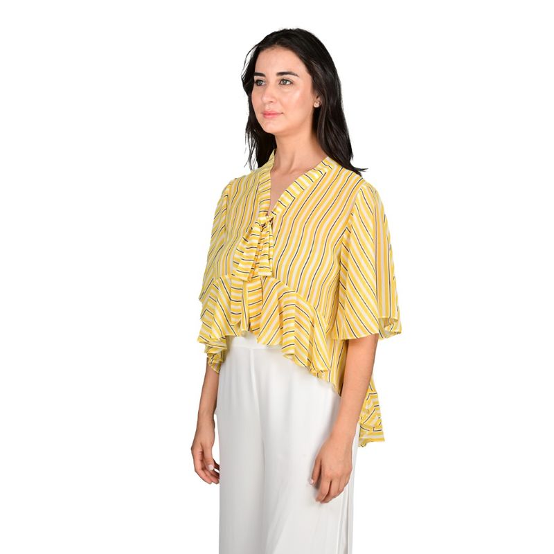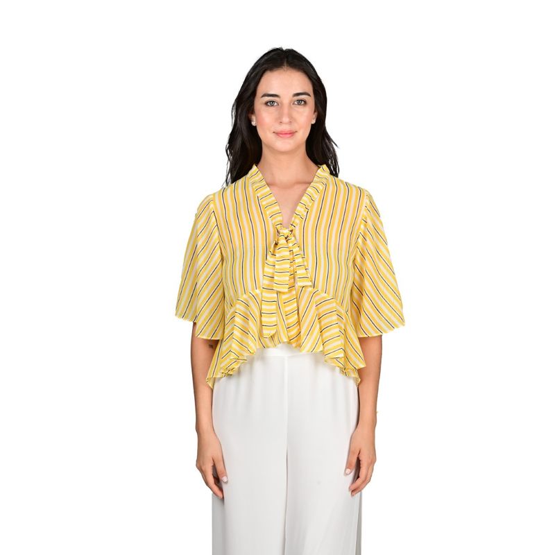 Blusa de mujer en gasa con un diseño fresco y juvenil, combinando rayas amarillas y blancas que aportan luminosidad al look. Su corte crop con bajo de volados y mangas cortas crea un efecto ligero y dinámico, mientras que el escote en V con detalle de lazada en el cuello añade un toque femenino y coqueto. Perfecta para el verano y días soleados, aporta un estilo alegre y sofisticado al mismo tiempo.
