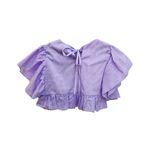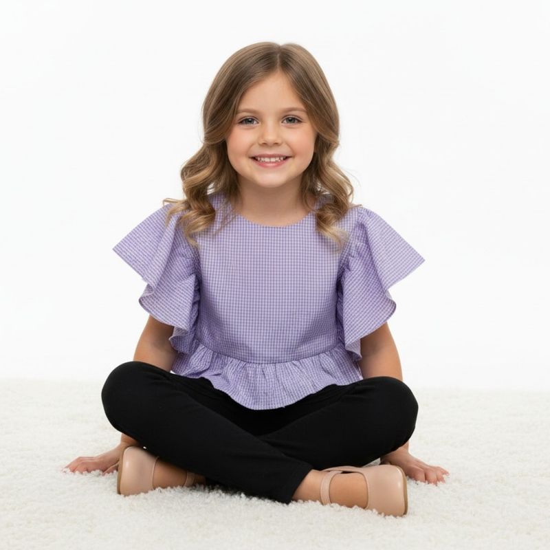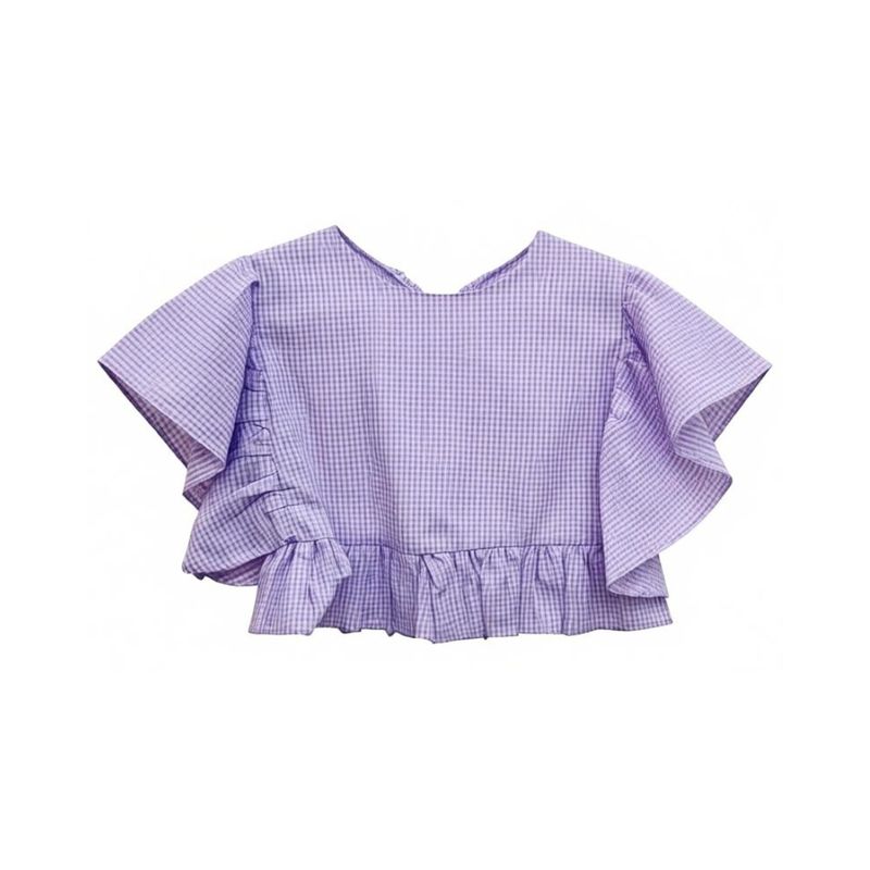 Blusa corta de niña en color lila con estampado de cuadros vichy, ideal para un look femenino y veraniego. Presenta escote en ‘V’ en la espalda con lazo de ajuste, mangas amplias con volantes tipo mariposa y dobladillo fruncido, aportando delicadeza y movimiento a cada conjunto.