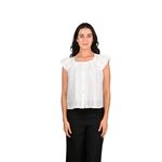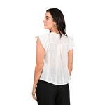 Presenta franjas verticales de bordado perforado que estilizan visualmente la silueta, mientras que el canesú trasero con pliegues aporta detalle y movimiento, realzando la caída de la prenda. Su corte ligero permite confort durante todo el día y facilita la combinación con distintas piezas de vestuario.