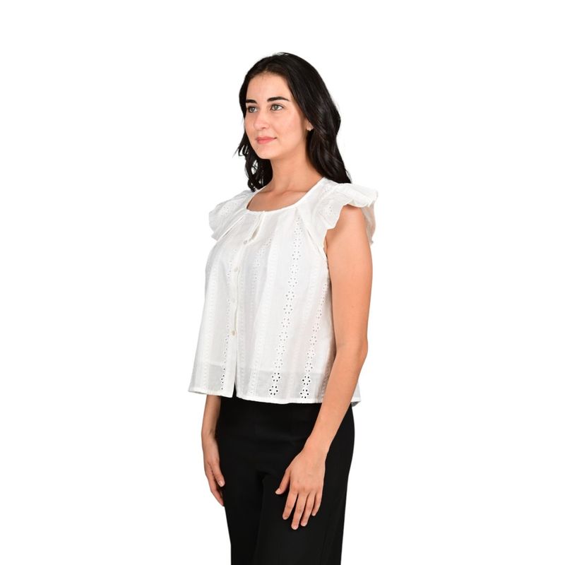 Esta blusa manga corta en broderi de Tiare es una prenda femenina y elegante, perfecta para quienes buscan un estilo delicado y cómodo. Su diseño combina volantes en las mangas y botones frontales, ofreciendo un look cuidado y sofisticado sin perder frescura.
