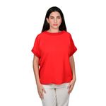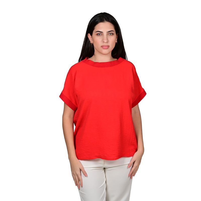 Esta blusa de manga corta combina modernidad, frescura y estilo en una sola prenda. Presenta un corte holgado que se adapta suavemente al cuerpo, ofreciendo libertad de movimiento y una silueta relajada ideal para el uso diario. El tono rojo brillante le da un aire vibrante y lleno de energía, perfecto para quienes disfrutan destacar con elegancia.