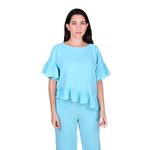 La Blusa Manga Corta En Crepe Con Volados Agua Marina de L'exclusif es una prenda femenina, versátil y con un encanto delicado que realza cualquier conjunto. Su corte oversize ofrece una silueta fluida y relajada, ideal para quienes buscan comodidad sin perder elegancia. Presenta un cuello redondo clásico que aporta equilibrio al diseño, mientras que las mangas cortas con doble volante añaden movimiento y un toque romántico.