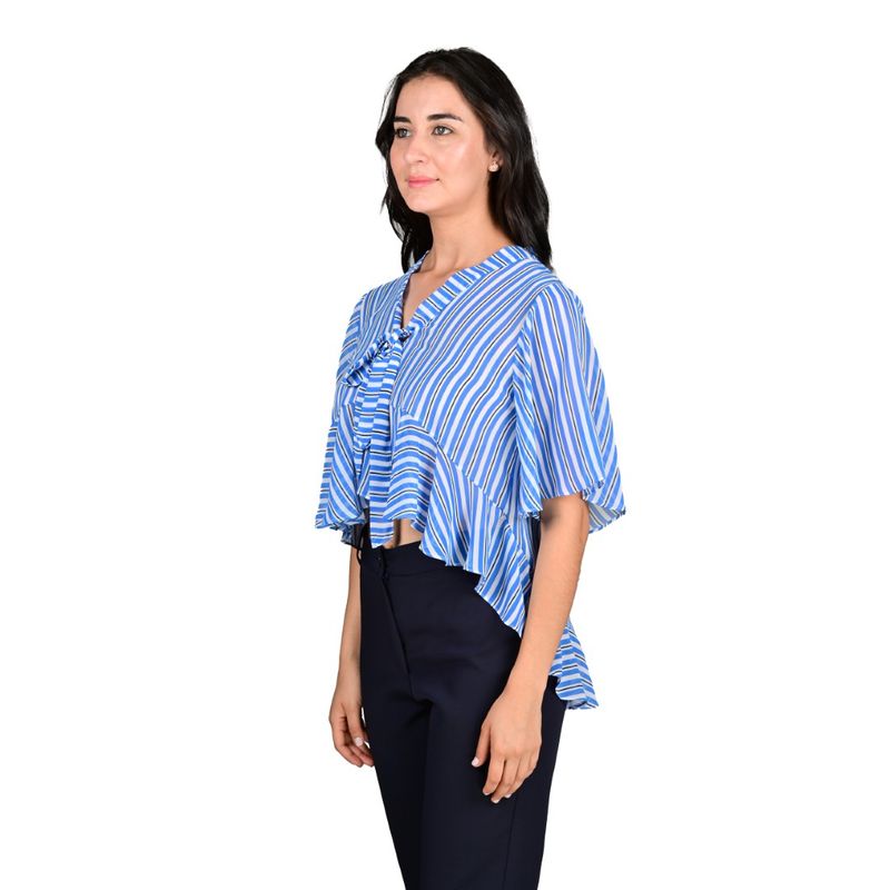 Blusa femenina de gasa ligera con estampado de rayas azules y blancas que aporta frescura y luminosidad. Presenta un escote en V con lazada ajustable en el cuello, mangas cortas fluidas y un bajo asimétrico con volados que genera movimiento y un diseño sofisticado. Ideal para un look primaveral o veraniego, combinando elegancia y comodidad.