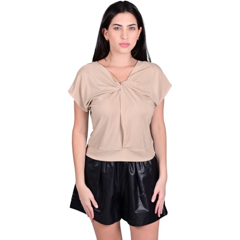 La Blusa Manga Corta Entrelazada Mujer Juliette destaca por su detalle entrelazado en el centro del escote, que forma un sutil escote en V y genera un efecto de drapeado o pliegues suaves en la parte delantera, aportando elegancia y sofisticación. El escote trasero redondo y simple complementa el diseño, mientras que las mangas cortas y holgadas tipo caída ofrecen comodidad y libertad de movimiento.