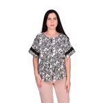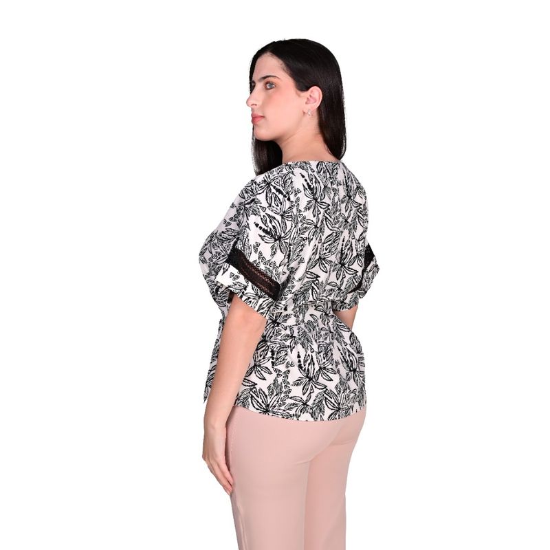 El estampado botánico de hojas grandes y oscuras sobre un fondo claro aporta un toque fresco y moderno, diferenciando esta blusa de modelos convencionales. Este diseño no solo sigue tendencias actuales de moda, sino que también permite combinarla con una amplia gama de colores y estilos, lo que la hace altamente versátil. Las mangas cortas de corte ancho incluyen un detalle de encaje calado en negro, que añade textura y elegancia, transformando la blusa en una opción ideal para eventos informales, salidas o reuniones.