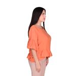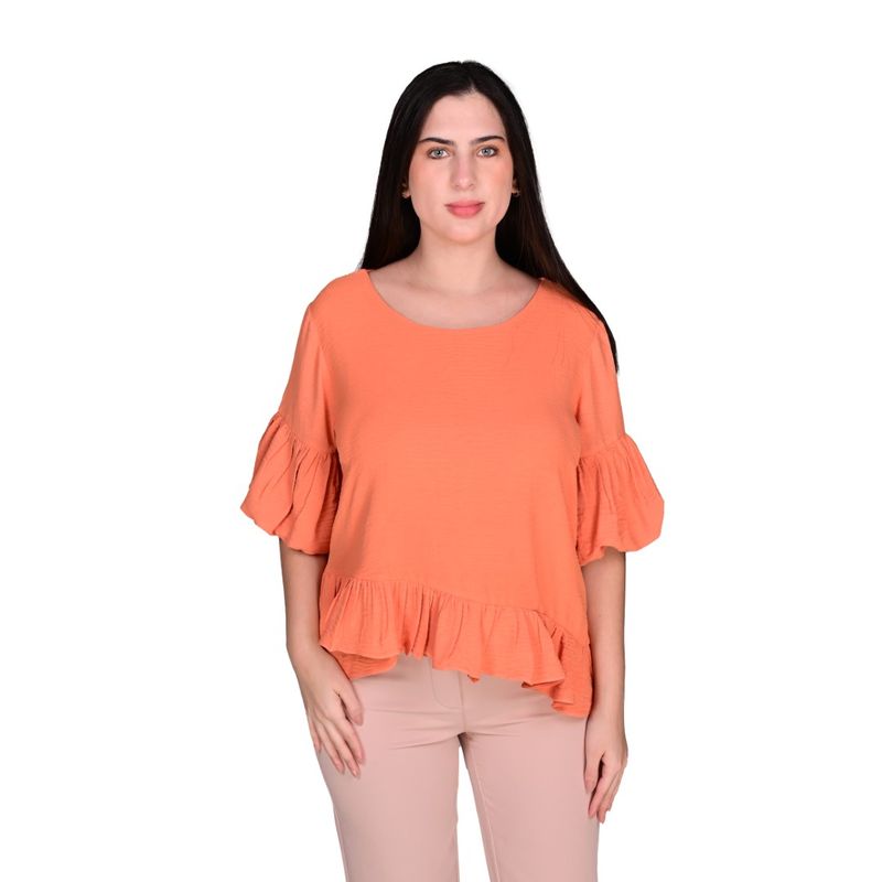 La Blusa de L'exclusif es una prenda fresca y femenina, ideal para el verano. Su color naranja vibrante y el diseño con detalles de volantes aportan modernidad y un toque alegre al look, convirtiéndola en una pieza versátil que puede combinarse tanto en outfits casuales como en conjuntos más sofisticados.