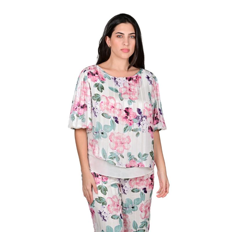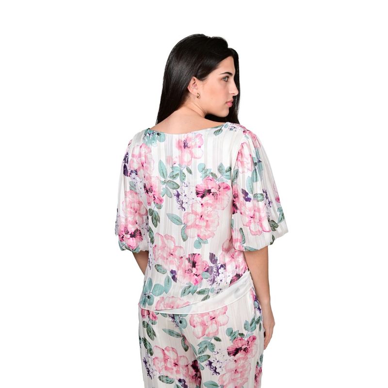 El tejido plisado verticalmente añade textura y dinamismo, mientras que la capa inferior de tela lisa proporciona estructura y confort al vestir. El estampado floral grande en tonos rosa y morado sobre base blanca/crema convierte a esta blusa en una pieza llamativa y femenina, perfecta para destacar en cualquier conjunto.