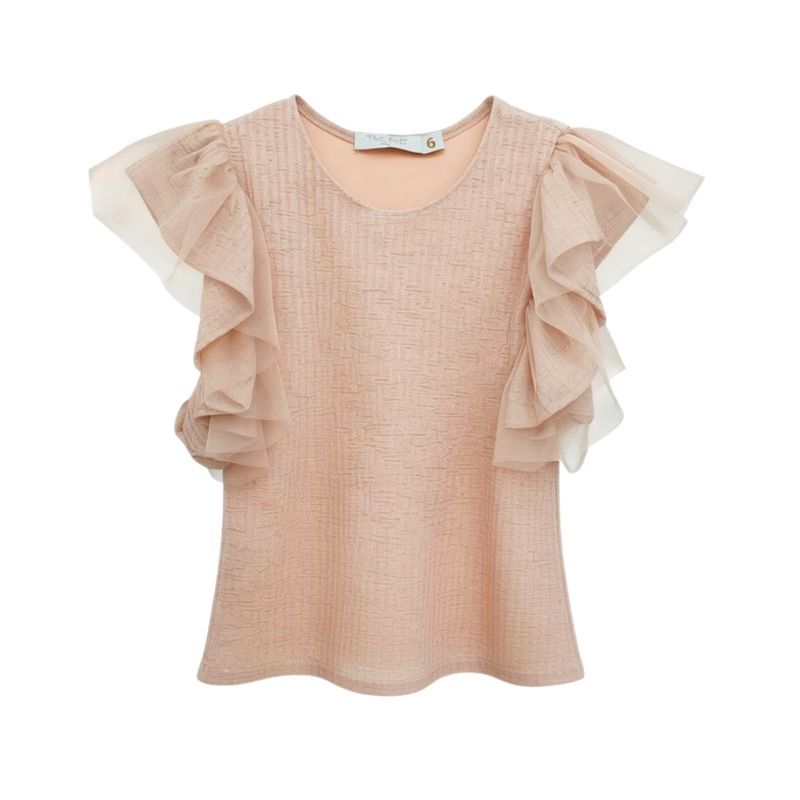 Blusa de niña en color rosa claro con textura, que combina elegancia y delicadeza. Presenta mangas cortas de volantes superpuestos de tul que generan un efecto voluminoso y sofisticado, junto a un cuello redondo que aporta comodidad y estilo. Esta prenda es ideal para looks femeninos y elegantes.