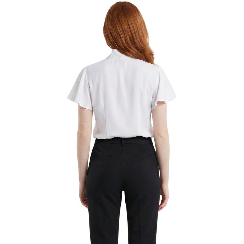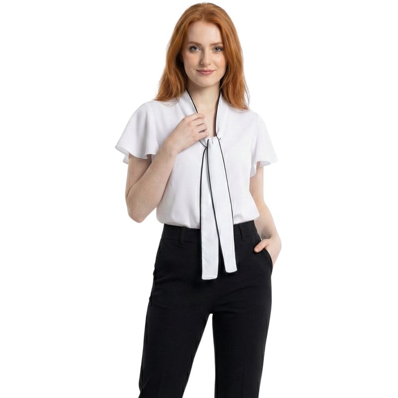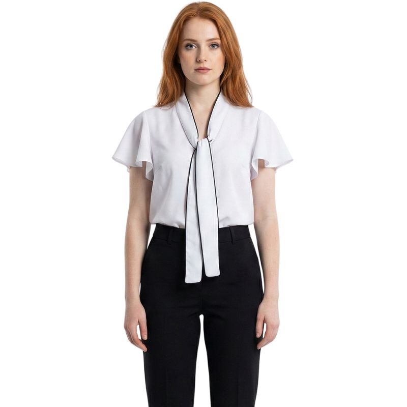 Esta blusa de tejido Atenas destaca por su manga mariposa y su elegante cuello tipo "pussy bow" con tiras largas rematadas con ribete negro, que aportan un toque sofisticado y femenino. Su diseño combina frescura y estilo, ideal para crear looks modernos y versátiles, desde ocasiones formales hasta salidas casuales con un aire elegante.