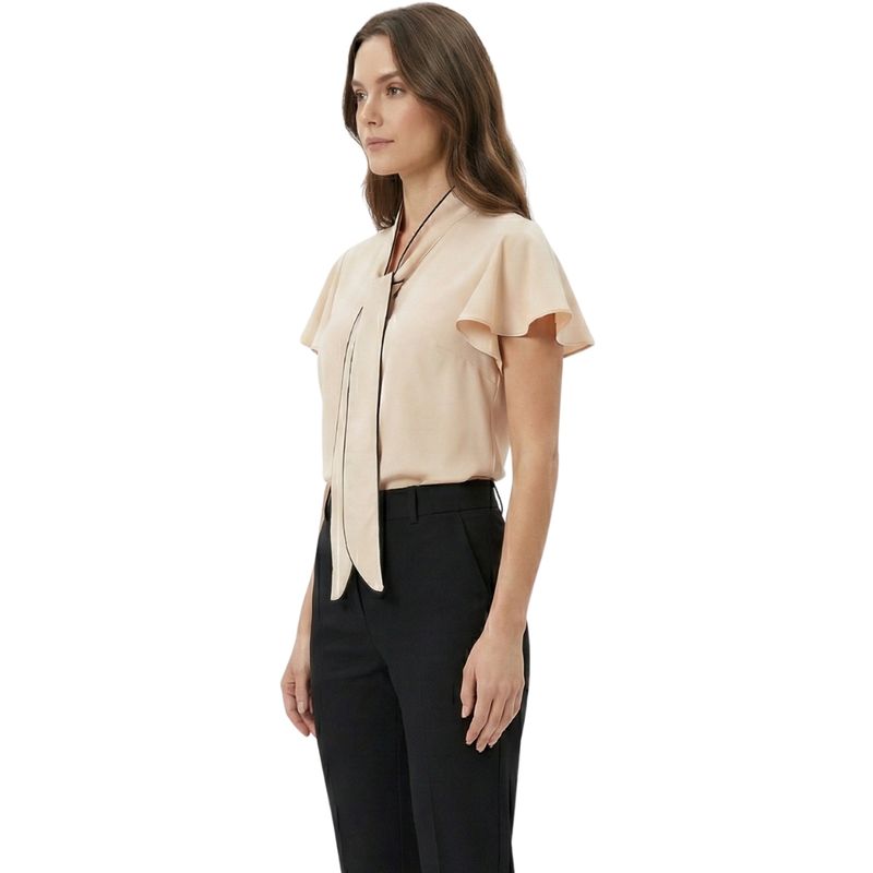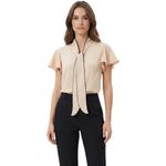 Esta blusa de tejido Atenas destaca por sus mangas mariposa y su sofisticado cuello tipo "pussy bow", con tiras largas rematadas con ribete negro que aportan un detalle elegante y moderno. Su diseño combina comodidad y feminidad, siendo ideal para looks casuales con estilo, reuniones laborales o salidas donde se busque un toque refinado.