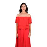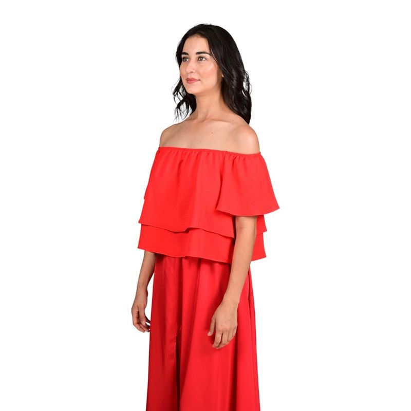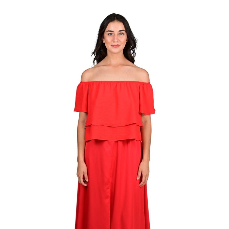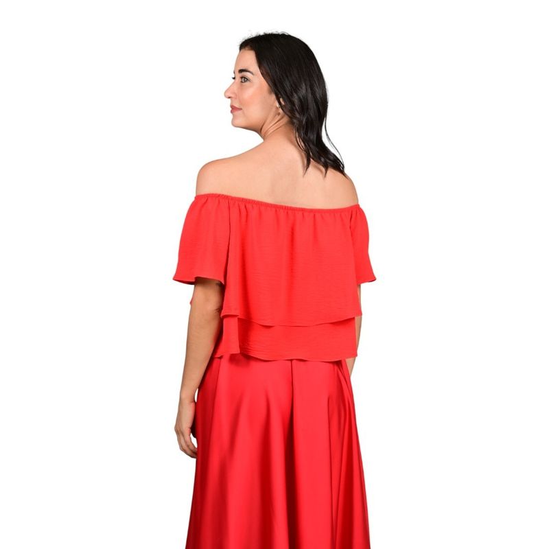 Su estructura fluida en crepe permite una caída suave y cómoda, mientras que el corte asimétrico de un hombro descubierto otorga un toque de modernidad y estilo. El diseño de doble capa con volantes amplios superpuestos crea una silueta favorecedora, cubriendo el pecho y formando mangas cortas. Estos detalles proporcionan movimiento y suavidad, dándole a la prenda una apariencia ligera y dinámica.