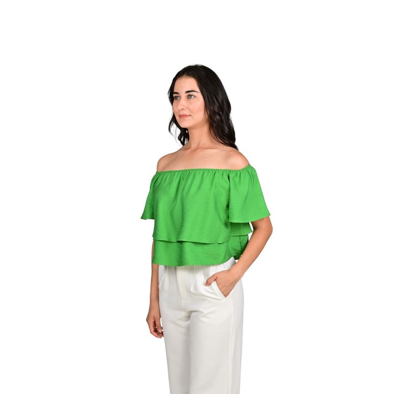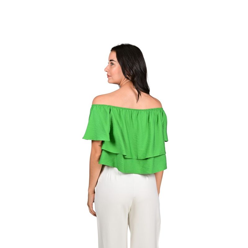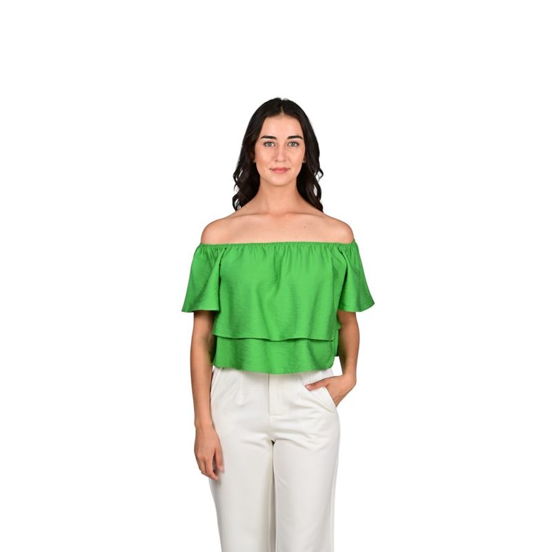 Esta blusa de un hombro en crepe verde destaca por su diseño moderno y femenino. El escote elástico y los hombros descubiertos aportan frescura, mientras que los dobles volantes superpuestos añaden volumen y movimiento, creando un look elegante y dinámico. Su corte fluido estilo crop la hace perfecta para combinar con prendas de talle alto y lograr conjuntos equilibrados y actuales.
