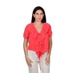 La Blusa Manga Corta Volantes Rojo Coral Mujer L'Exclusif es una prenda elegante y llamativa, diseñada para mujeres que buscan un look femenino y sofisticado. Su manga corta permite mayor libertad de movimiento y comodidad, mientras que el escote en V profundo con volantes en cascada en el frente añade un detalle dinámico y delicado que resalta la feminidad. El cuello con lazo fino ajustable ofrece un toque romántico y versátil, permitiendo personalizar el ajuste y el estilo del escote según la ocasión.