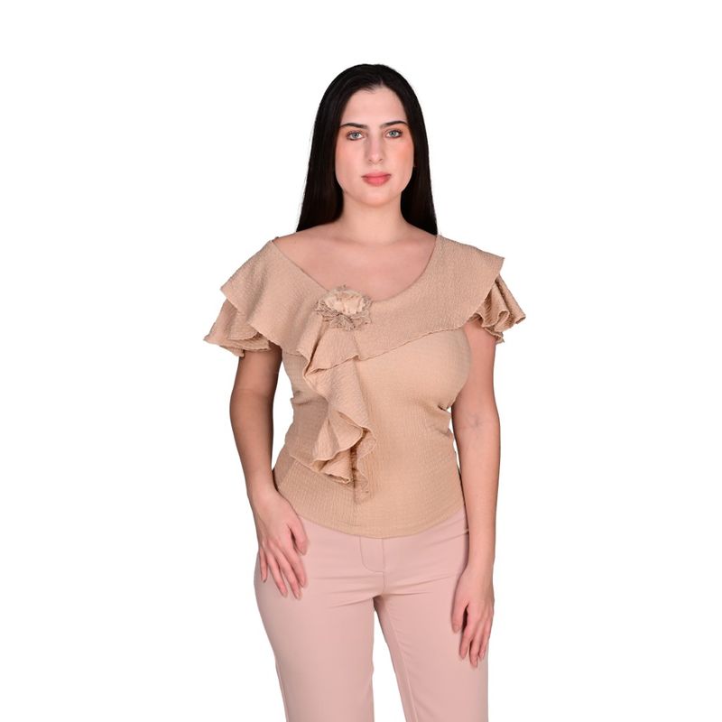 El cuerpo de la blusa es ceñido, asegurando un calce favorecedor, mientras que los volantes aportan volumen decorativo y movimiento, logrando un equilibrio perfecto entre estructura y fluidez. Esta combinación resalta la figura femenina con delicadeza y estilo.