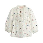 Esta encantadora blusa manga larga de Original Marines está diseñada especialmente para las más pequeñas, con un estilo tierno y elegante que resalta por sus bordados y estampados de pequeñas cerezas y flores. Su diseño combina suavidad, comodidad y un toque clásico que la hace perfecta para cualquier ocasión, desde un paseo familiar hasta un evento especial.