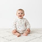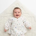 El cuello mao le aporta un aire refinado y moderno, mientras que las mangas abullonadas con puño elástico ofrecen un ajuste cómodo que facilita el movimiento del bebé. Los pliegues frontales y los botones de madera en la parte superior completan un diseño lleno de detalles delicados y naturales.