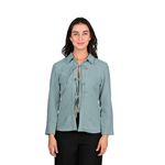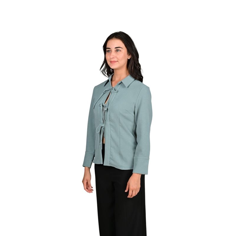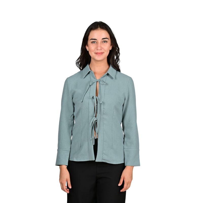 Esta blusa manga larga combina elegancia y un diseño moderno con un toque femenino. Presenta tres lazos estratégicamente colocados que aportan un detalle distintivo y sofisticado, ideal para quienes buscan un look trendy y versátil. Su corte favorecedor se adapta cómodamente al cuerpo, ofreciendo estilo sin sacrificar comodidad.