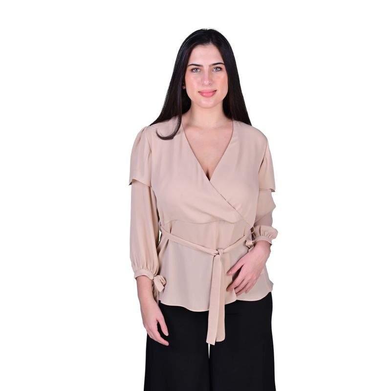La blusa manga larga en gasa beige para mujer de Juliette destaca por su diseño cruzado con escote en V que realza la figura de manera elegante. Cuenta con un cinturón anudado en la cintura que permite ajustarla a medida, aportando un toque femenino y favorecedor. Los volantes delicados en los hombros y puños suman un detalle romántico que la convierte en una prenda perfecta para ocasiones formales, reuniones de trabajo o eventos especiales.
