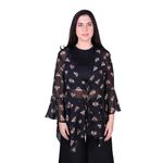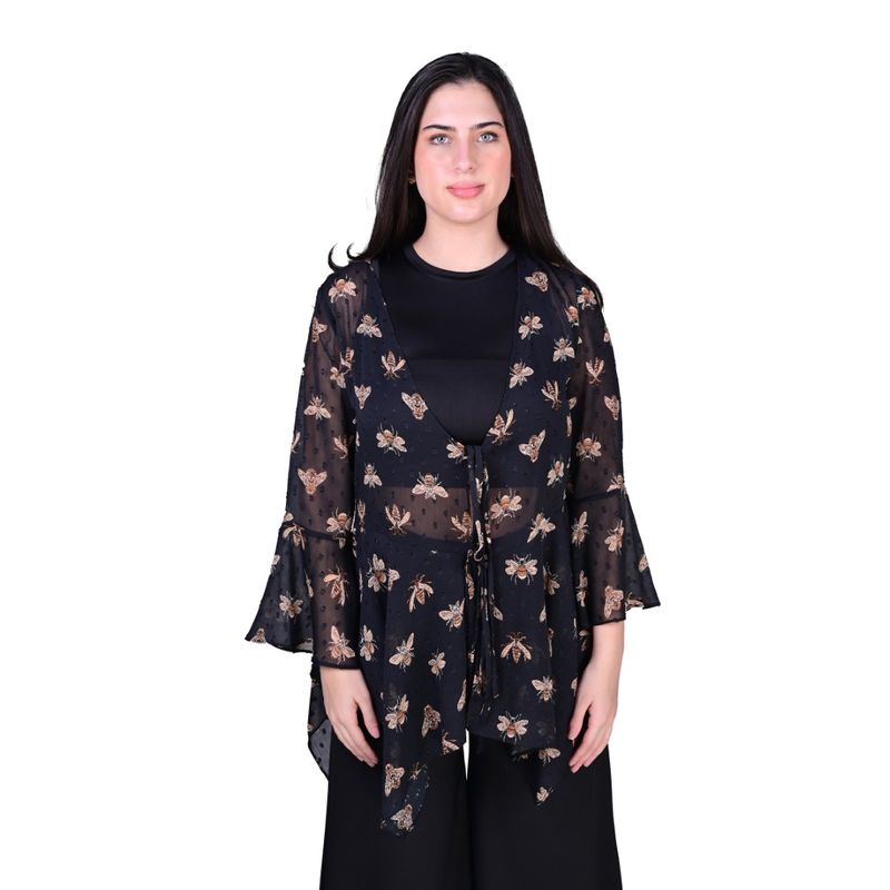 Esta blusa para mujer de la marca L'exclusif destaca por su estilo boho, ideal para quienes buscan una prenda femenina y sofisticada. De color negro con un delicado estampado de pequeñas mariposas, la blusa cuenta con un tejido semitransparente que aporta ligereza y frescura. Los volados frontales que caen desde los hombros añaden un movimiento suave y un detalle visual muy atractivo.