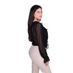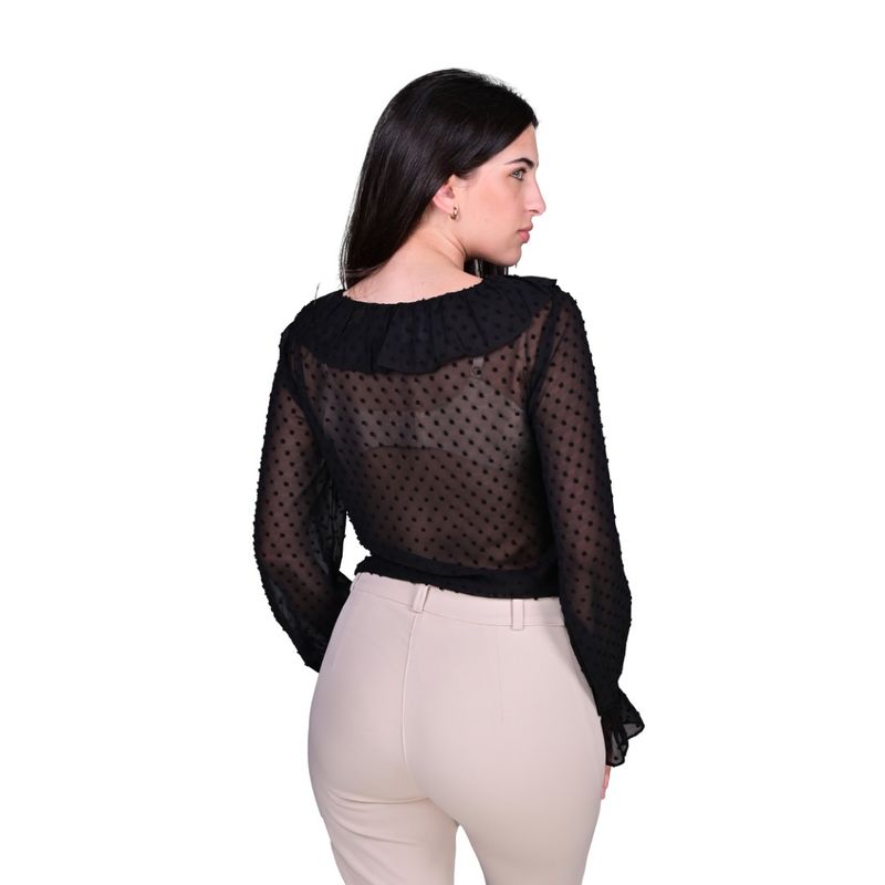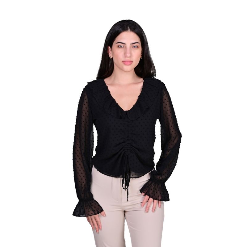 Sumá un toque romántico y sofisticado a tu vestuario con esta blusa negra de manga larga para mujer de la marca Juliette. Su diseño combina elegancia y comodidad, ideal para lucir tanto en el día como en la noche. Las mangas largas son semitransparentes, con sutiles puntos en relieve que aportan textura y un aire delicado. El escote en V está adornado con volantes suaves, y el detalle fruncido con cordón ajustable en la parte inferior permite definir la silueta de forma favorecedora.