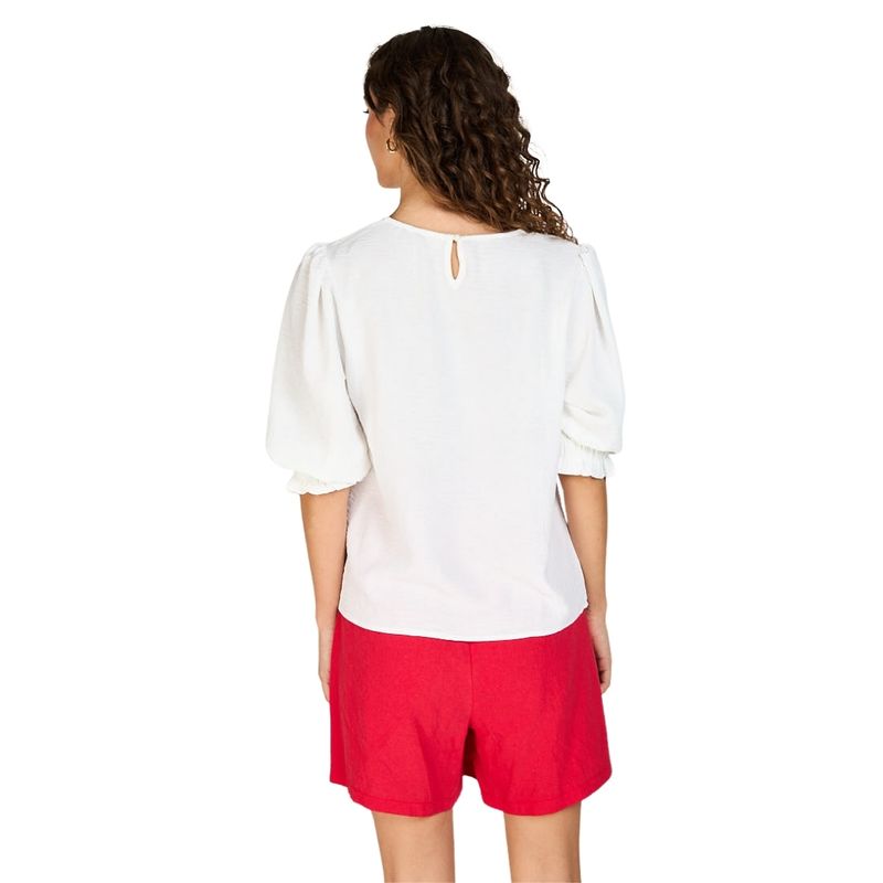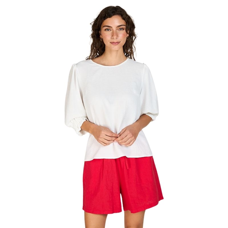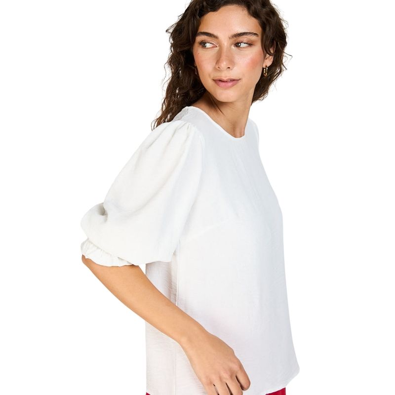 Características Principales: Esta blusa presenta el color blanco en su máxima expresión de pureza y versatilidad, convirtiéndose en una pieza fundamental para cualquier guardarropa. Su escote redondo crea una línea elegante y favorecedora, mientras que las mangas abullonadas aportan volumen y dramatismo romántico que realza la feminidad natural.